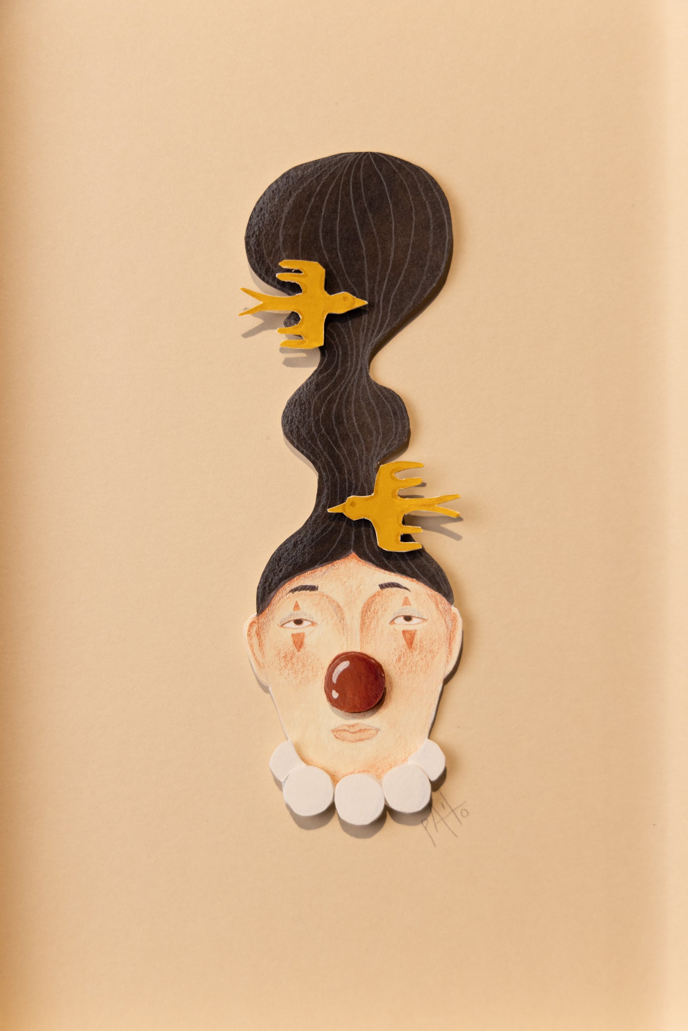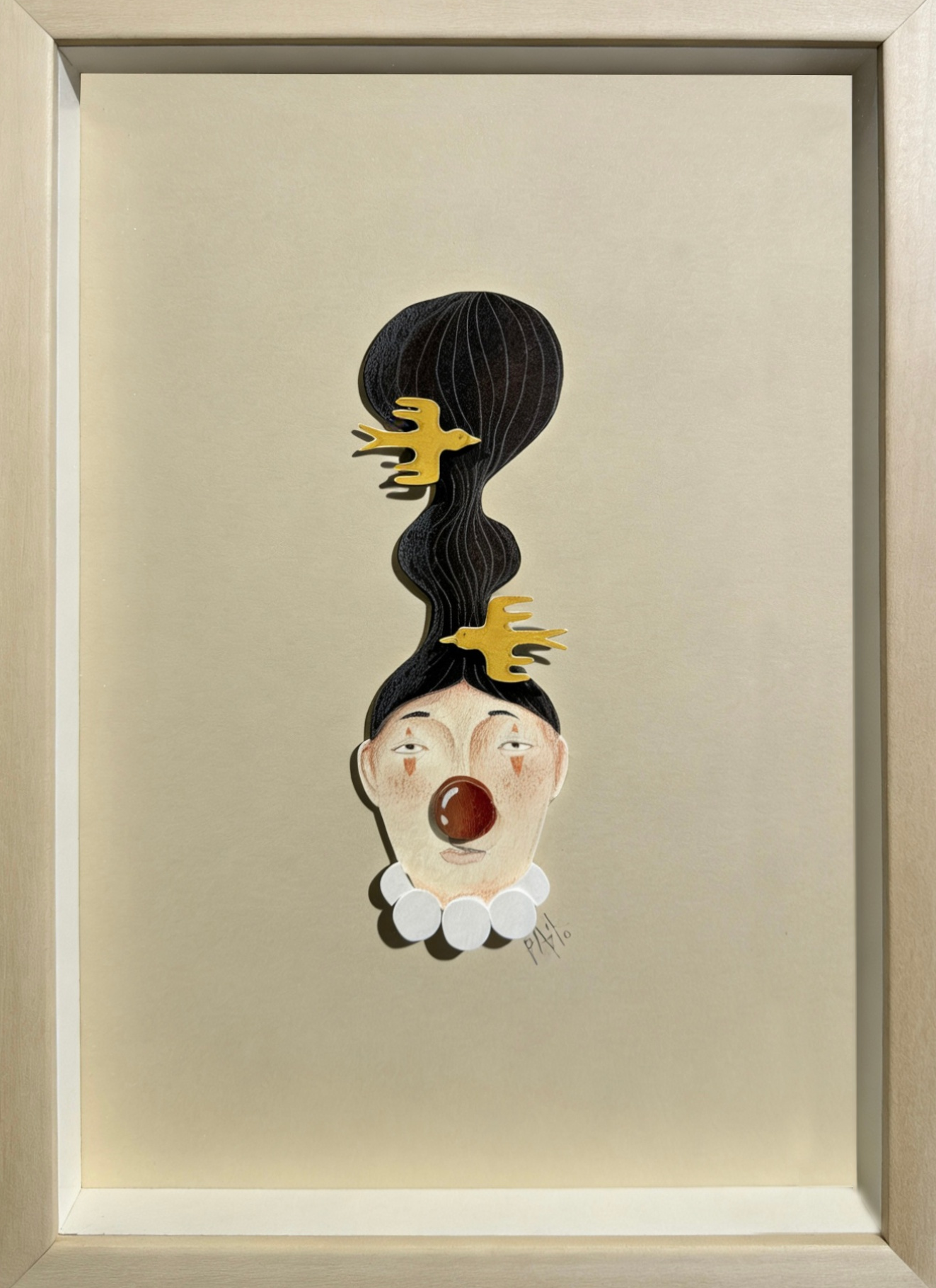 Esta obra es parte de una serie llamada, mi vida es un circo, el payaso siempre es alguien que hace reir al resto ignorando sus propias necesidades, aquí la payasa es un recordatorio de no caer en esa tentación, los pájaros representan la libertad y romper esas cadenas.